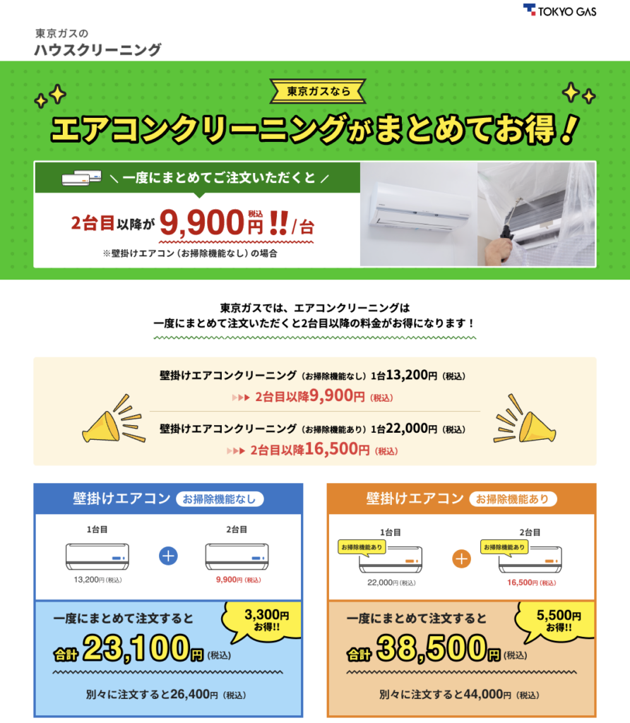 | まとめ買いでお得(2台目以降9,900円) | 2台目以降が9,900円/台(壁掛けエアコン・お掃除機能なしの場合)と、複数台のエアコンをまとめてクリーニングする場合にお得 |