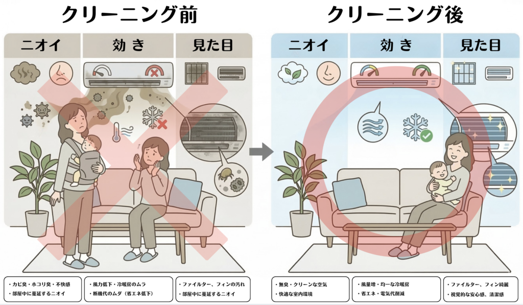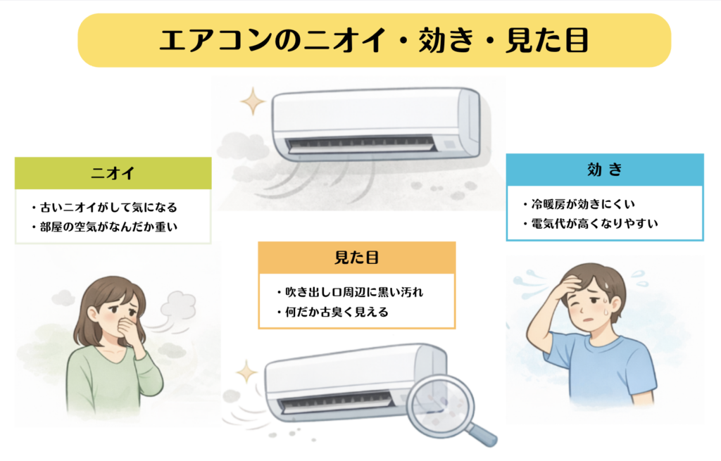 エアコンクリーニングの主な実感ポイントはニオイ・効き・見た目ですが、汚れがたまった状態を長く続けることは、それ以外の面にも関係することがあります。