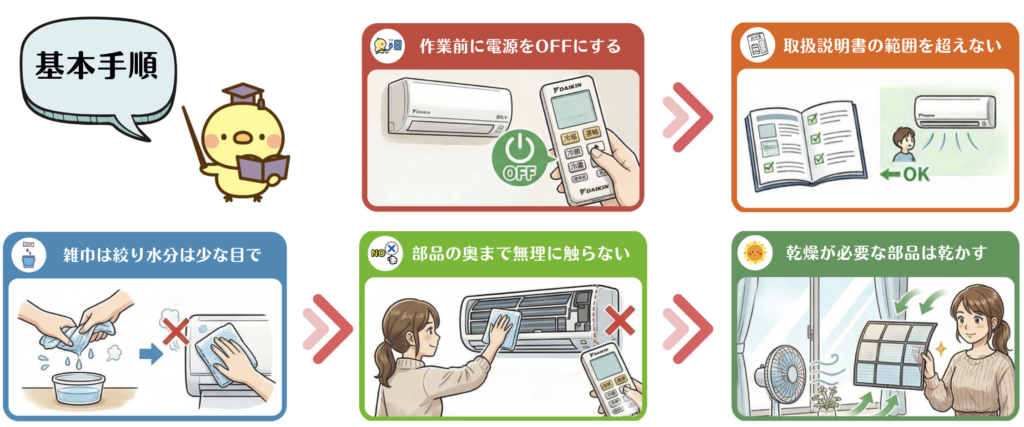 自分でエアコン掃除をするときは、次の点を押さえておくと失敗しにくくなります。