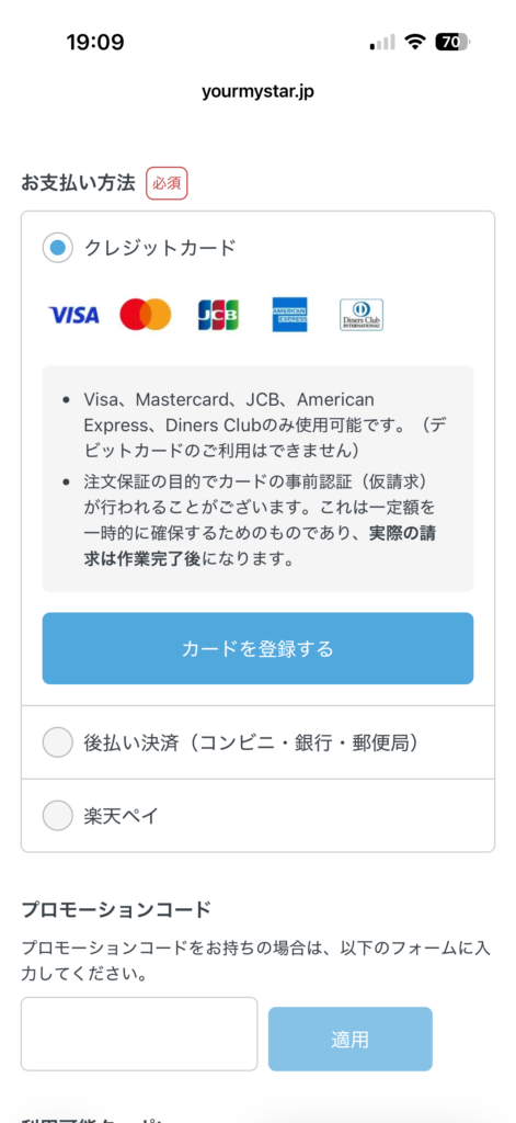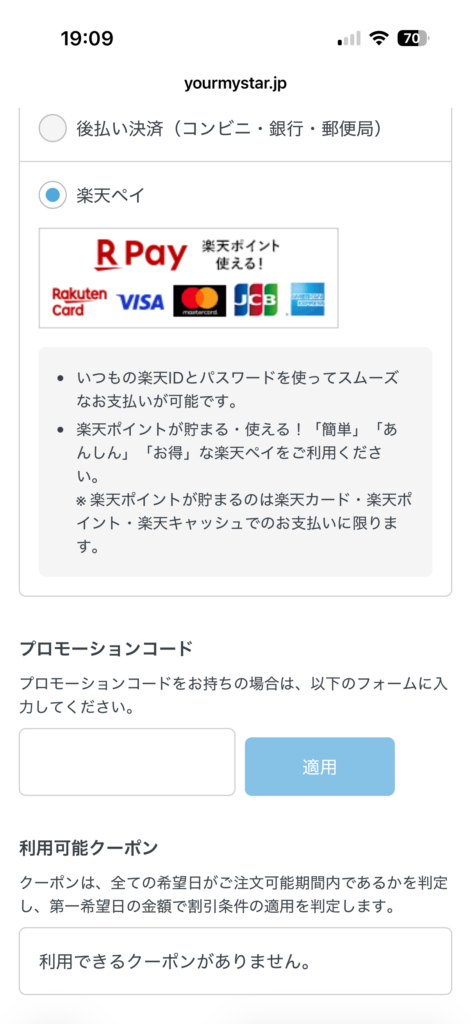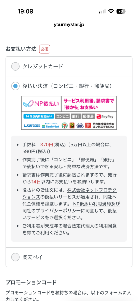 ※ 支払い方法は「クレジットカード」「後払い決済」「楽天Pay」が選択できます。