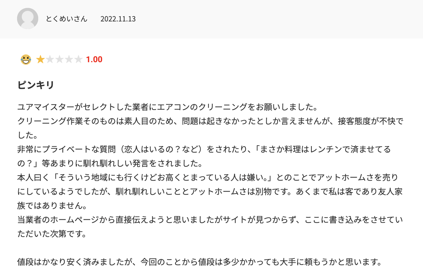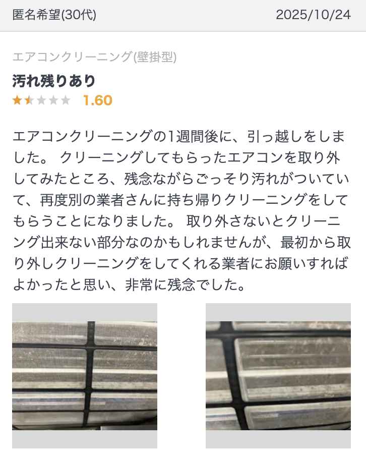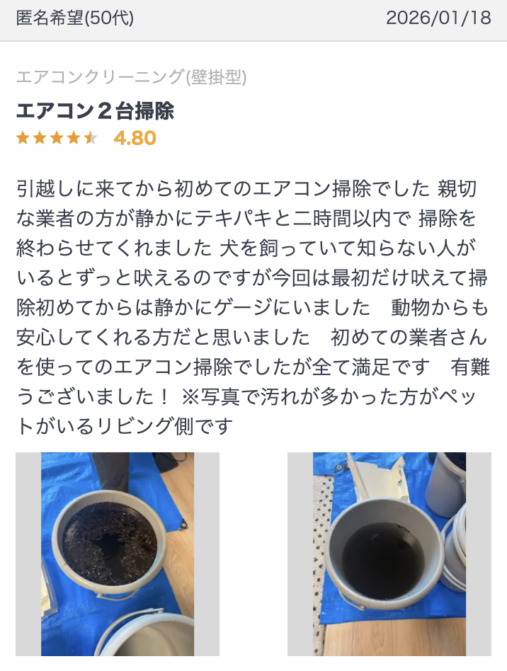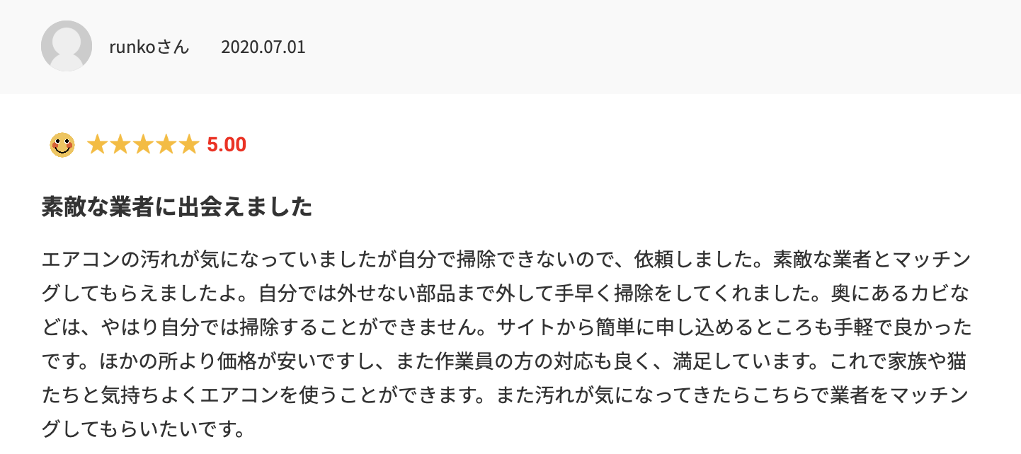 | 想像を超えた「神対応」 | 「適当に選んだ業者だったが、想像以上に親切だった。浴室の排水溝までついでに綺麗にしてくれたり、壊れていたエアコンの羽を後日無償で直してくれた」 |