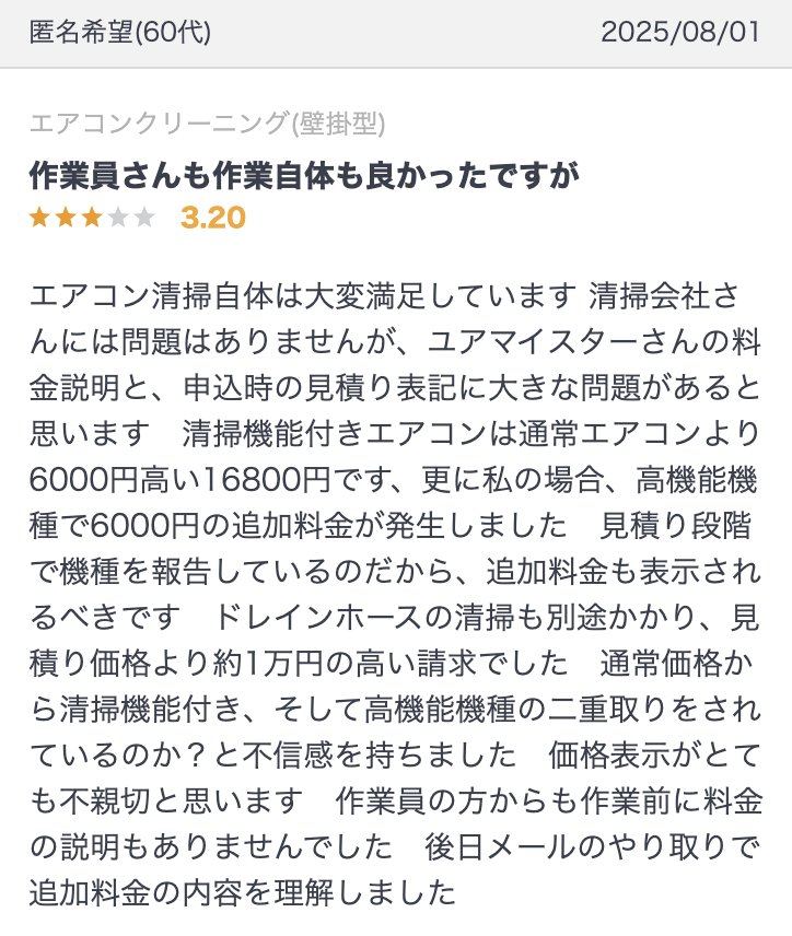 | 作業品質・故障トラブル | 「エアコンクリーニング後から、使用するたびに雑巾のような臭いがするようになった」「作業直後にエアコンのカバーが歪んでいた」 |