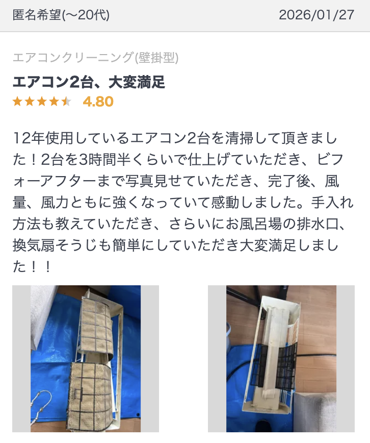| プロならではの仕上がり | 「自分ではフィルター掃除とスプレーくらいしかできなかったが、プロに頼んだらビックリするくらい汚れていた。やっぱりプロに任せるに限る」 |